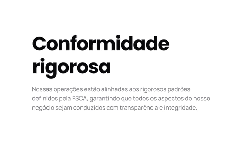 A segurança e a confiança dos nossos clientes vêm em primeiro lugar. Temos o prazer de anunciar que somos totalmente governados pela Financial Sector Conduct Authority (FSCA). Este firme compromisso com a adesão regulatória incorpora nossa devoção em oferecer um ambiente de negociação seguro e claro.